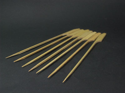 鉄砲串は持つ所が太くなっている、鉄砲みたいな形状をした竹串です。 持ち手部分に焼印などを押して、商品名をわかりやすくしたりします。